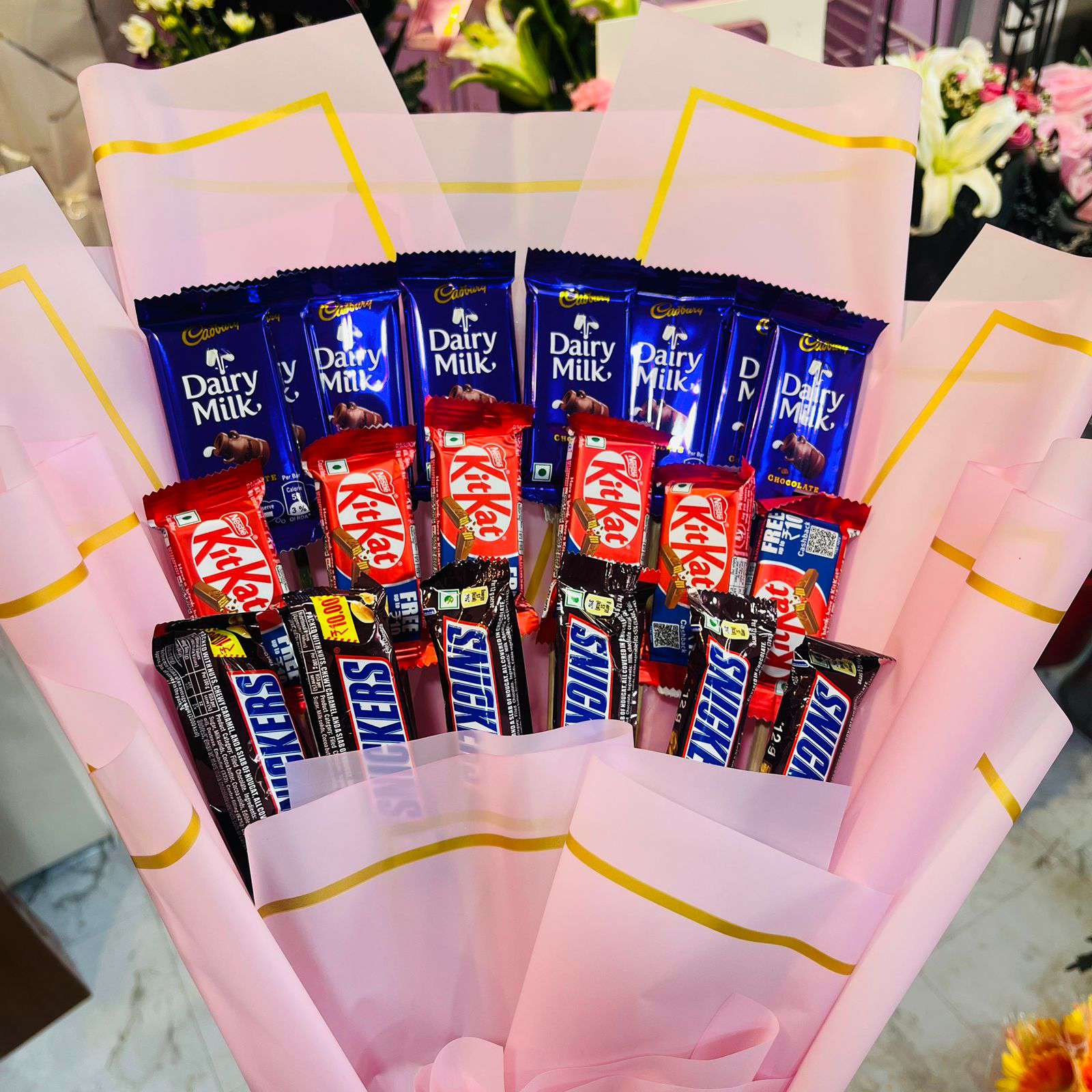 This product is a fun and indulgent Handmade Gift Bouquet. It features a wonderful mix of popular chocolate bars, including Dairy Milk, KitKat, and Snickers. The chocolates are arranged like flowers in a colorful display. The bouquet is wrapped in lovely light Pink paper with elegant gold accents. It is finished beautifully with a wide White and Gold striped ribbon.