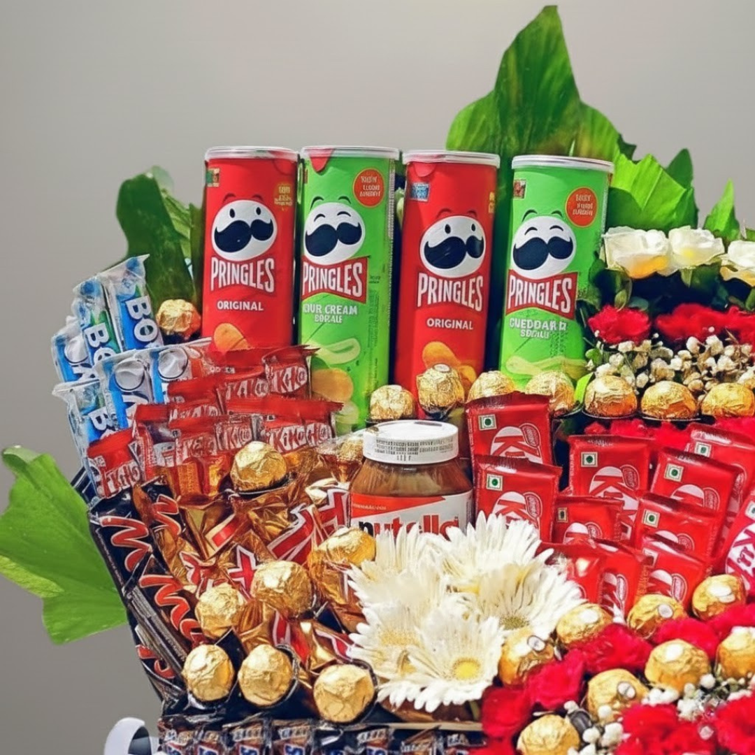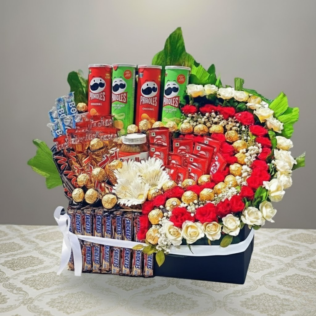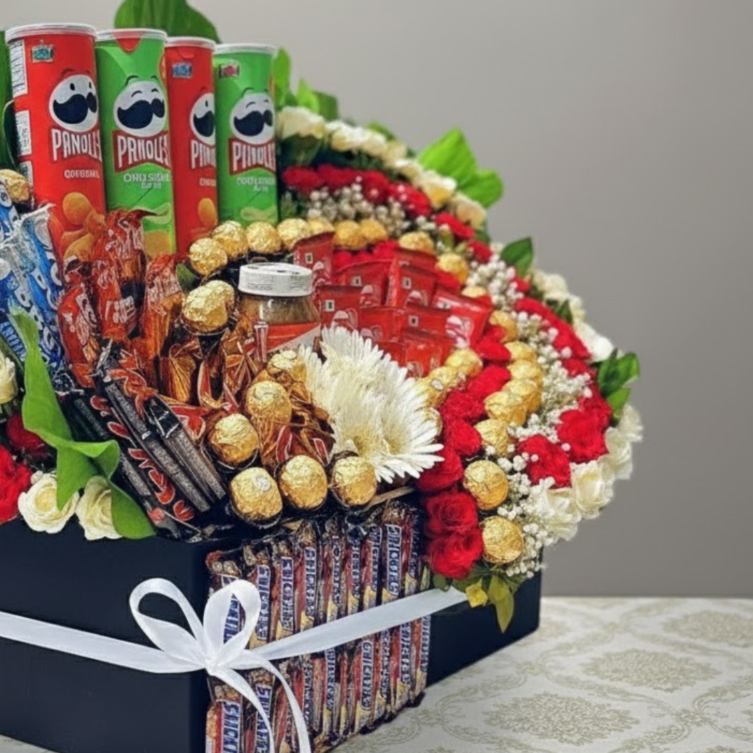 Ultimate Snacks, Chocolate, and Flower Hamper Box