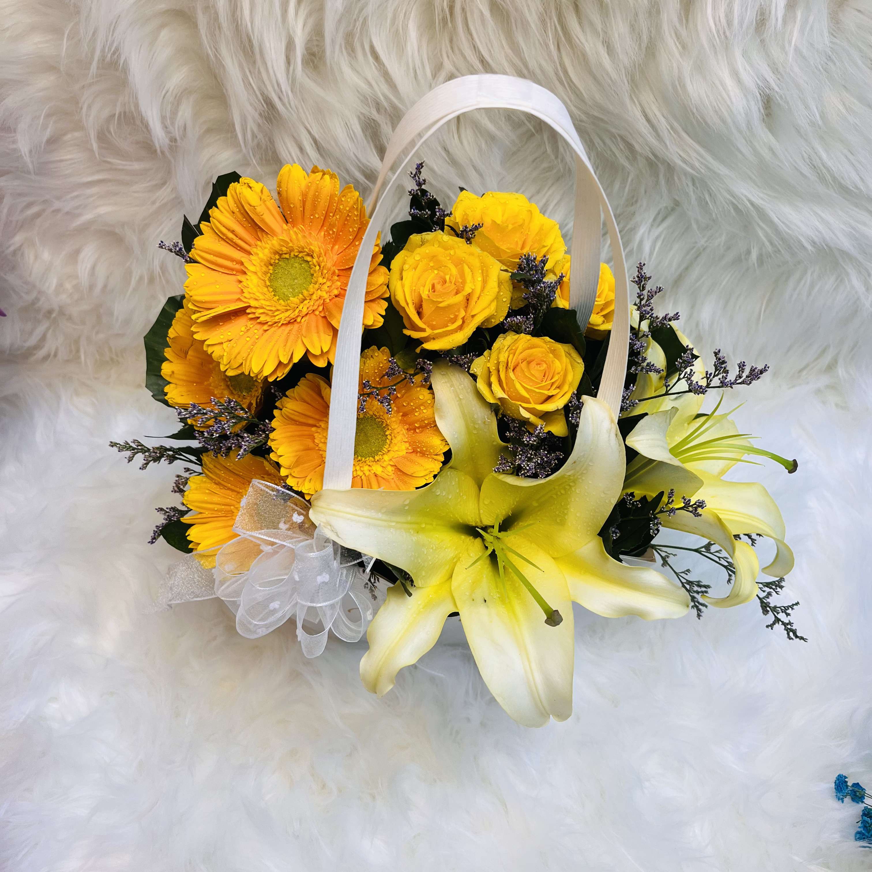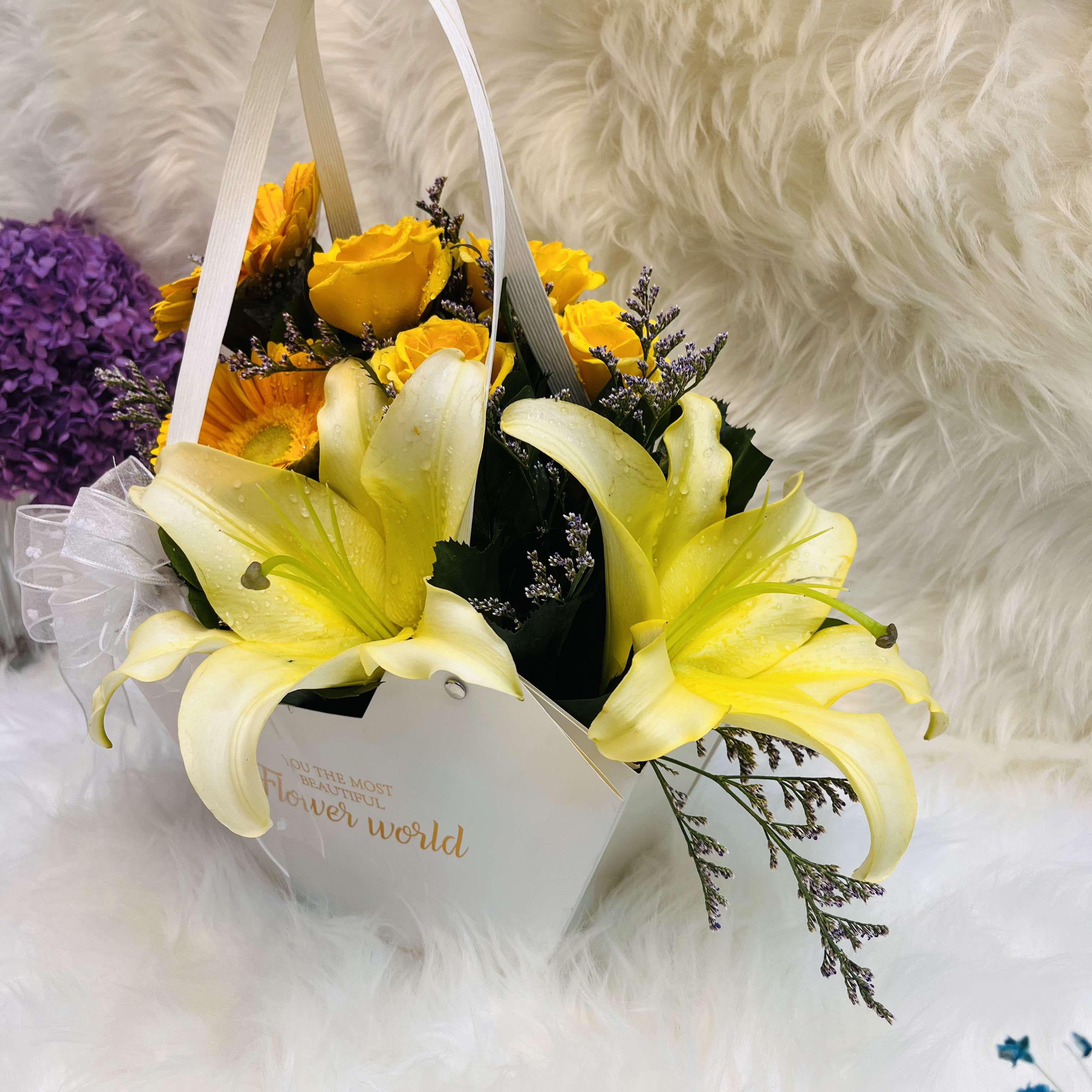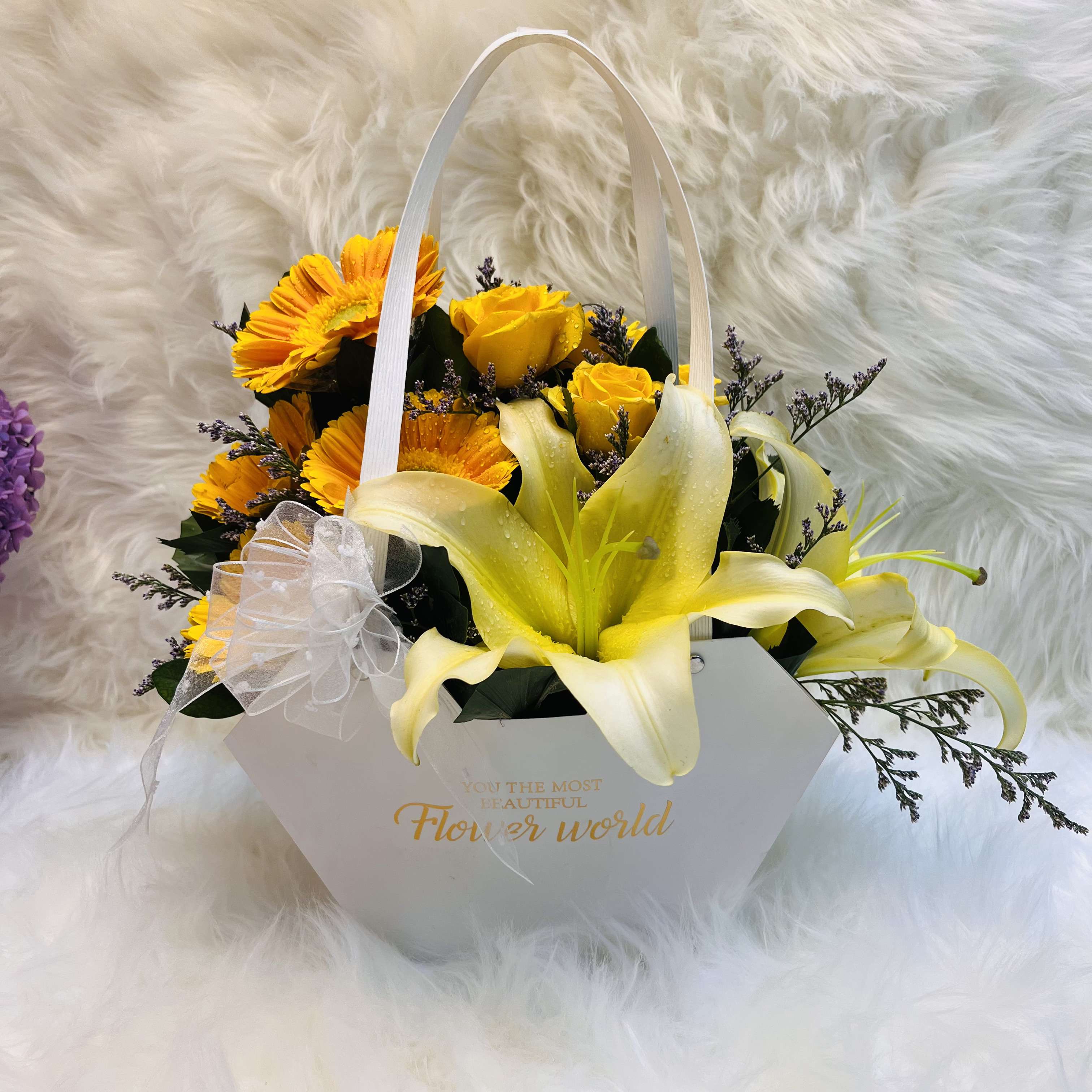 Yellow Harmony Lily, Gerbera & Rose Hexagonal Gift Bag